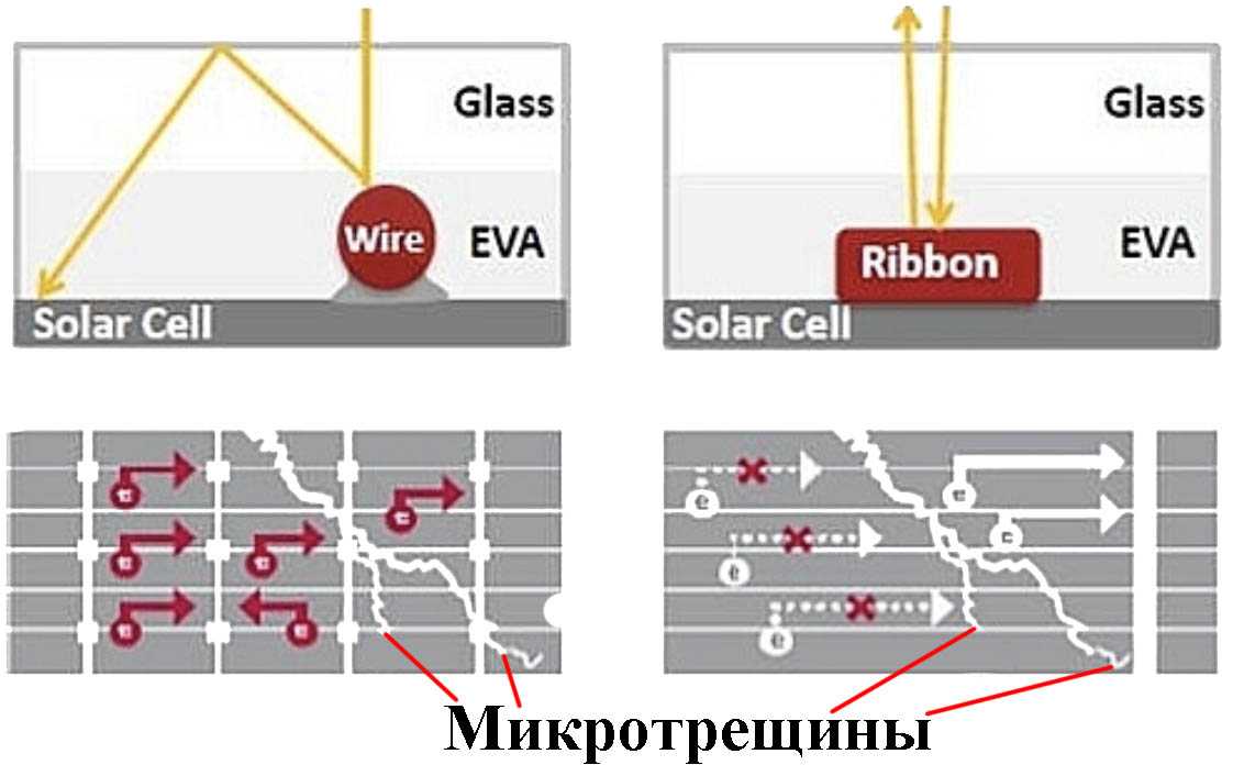 Trina Solar вместе со многими другими производителями недавно начали предлагать тонкие круглые шинные ячейки под названием multi-bus (MBB) в качестве опции для ряда модулей на 2019 год. Как объяснялось ранее, еще одним преимуществом наличия большего количества шин является то, что при микротрещинах возникновение в ячейке из-за внешних напряжений, меньше вероятность того, что это создаст горячую точку, так как электроны имеют много альтернативных шин для протекания тока. Это показано на рисунке:
