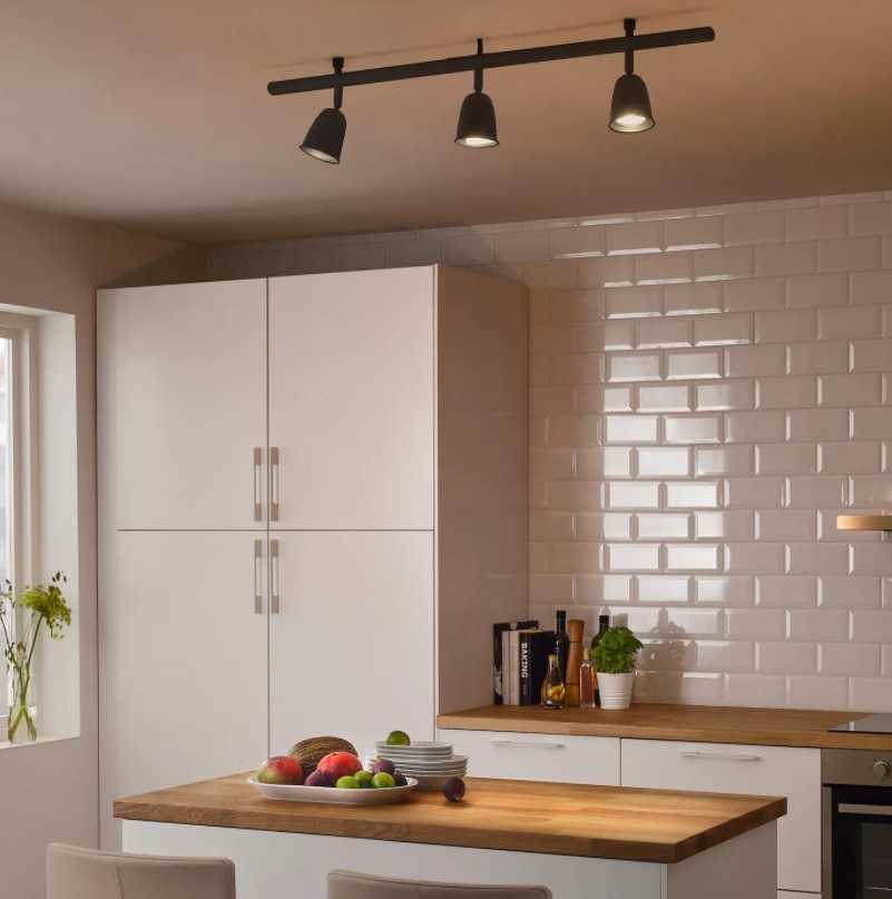Учтите, что плафоны, направленные вниз, будут освещать очерченное пространство под ними. Если же плафоны будут направлены вверх, свет будет отражаться от полотна потолка и мягко рассеиваться, обеспечивая кухне уютный вид.