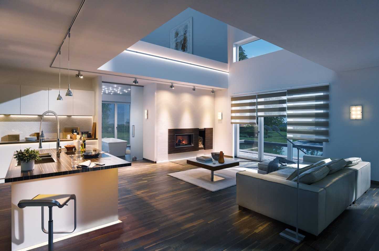 Кухня-гостиная в белом цвете будет выглядеть просто шикарно, и бояться это цвета не стоит, потому что с его помощью и малогабаритная квартира, и огромный особняк могут выглядеть стильно и современно.