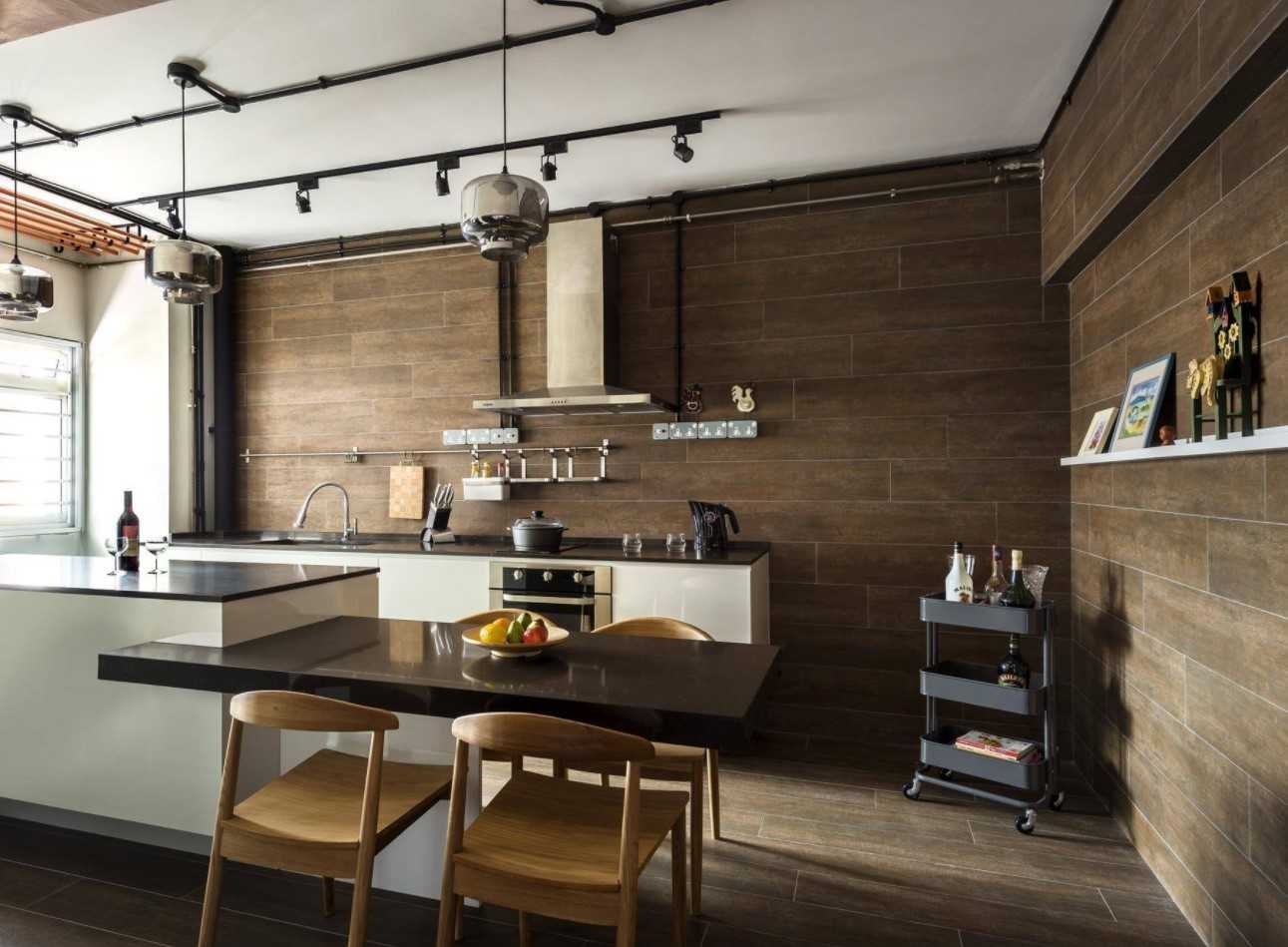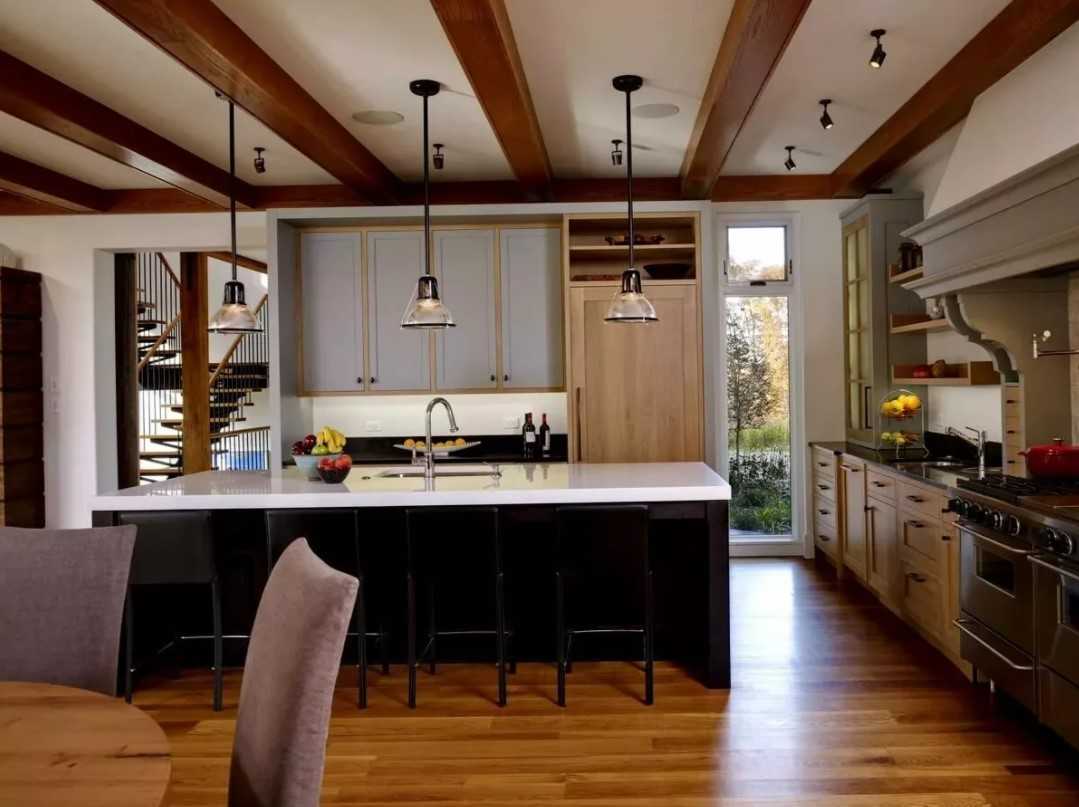 Людям, в чьих домах такая просторная кухня, повезло намного больше. Они могут оформить одно помещение в нескольких стилях. К примеру, пол в проходе на кухню можно выложить ламинатом, а участок за барной стойкой – разноцветными плитками.