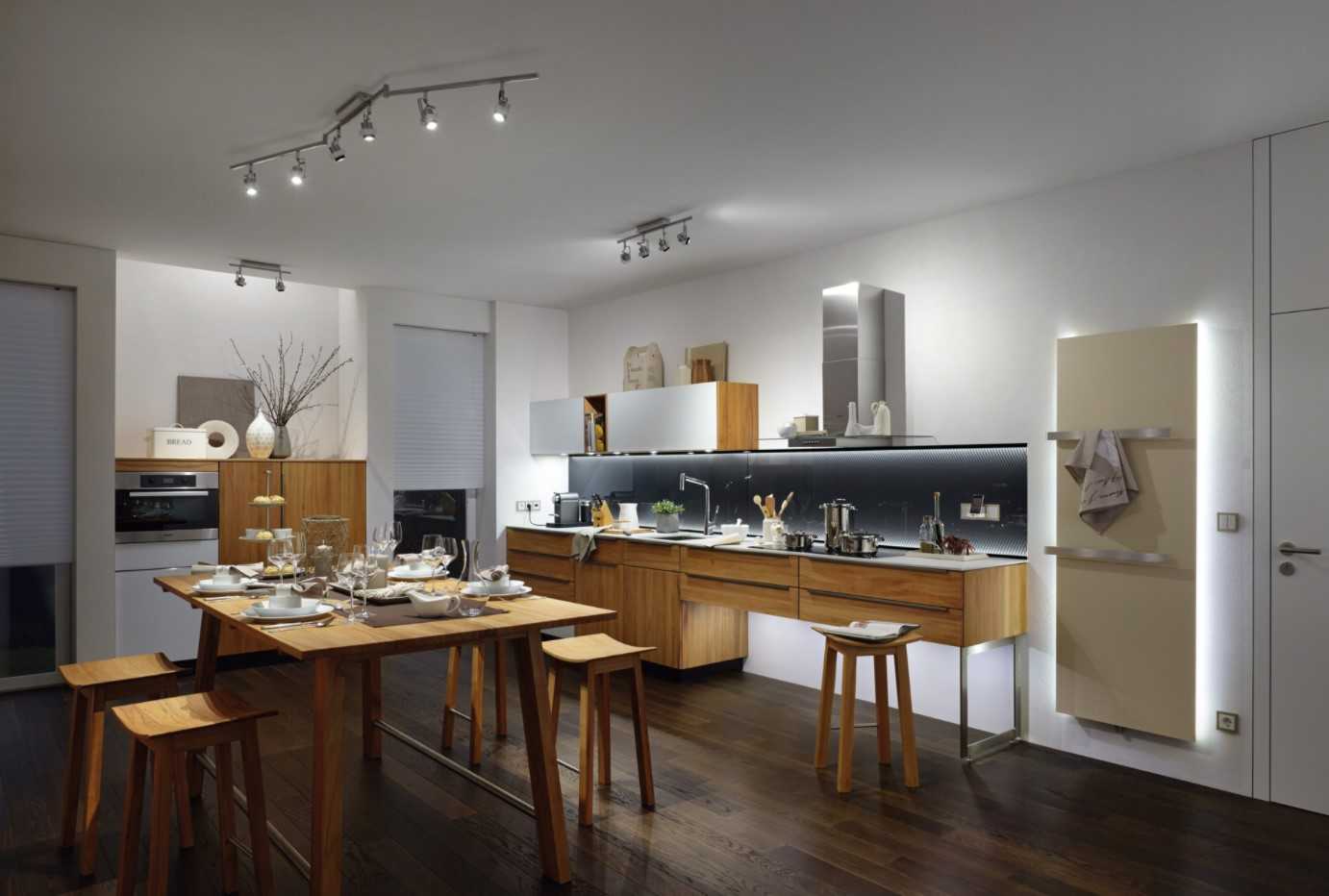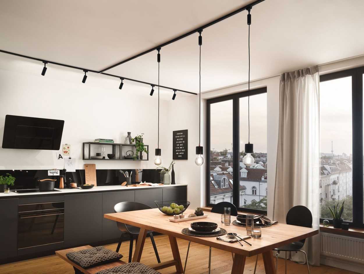 Еще один выигрышный вариант — параллельно протянуть две трек-системы. Светильники одной можно направить на зону отдыха, а другую использовать для подсветки обеденного комплекса.