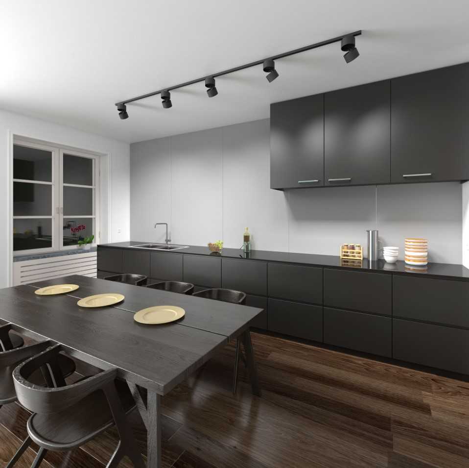 На кухнях, выполненных в современном стиле, эффектно смотрятся окрашенные в черный цвет треки. Особенно, когда контрастируют с белым потолком либо излучающей подчеркнуто урбанистическую красоту обстановкой.