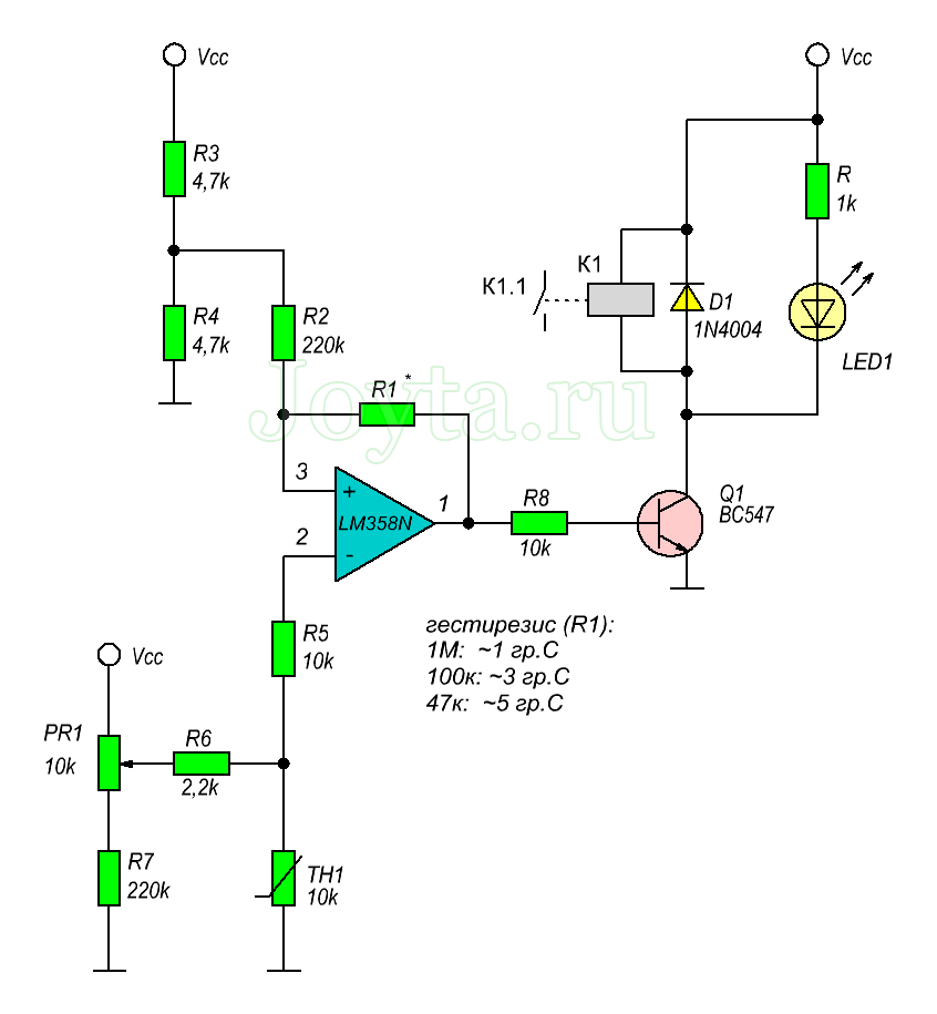 - Чтобы обеспечить перепад температур, то есть срабатывание терморегулятора, к примеру, при 23-х градусах, а отключение – при 25-ти, необходимо при помощи резистора создать отрицательную обратную связь между выходом и прямым входом компаратора.