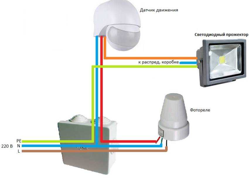 Для включения света только в период нахождения человека используется датчик движения. В этом случае датчик подключают после фотореле. Он будет работать только в вечернее время. В датчике движения также можно регулировать задержку включения, чтобы он не срабатывал от движения ветки или пролетаемой мимо птицы.