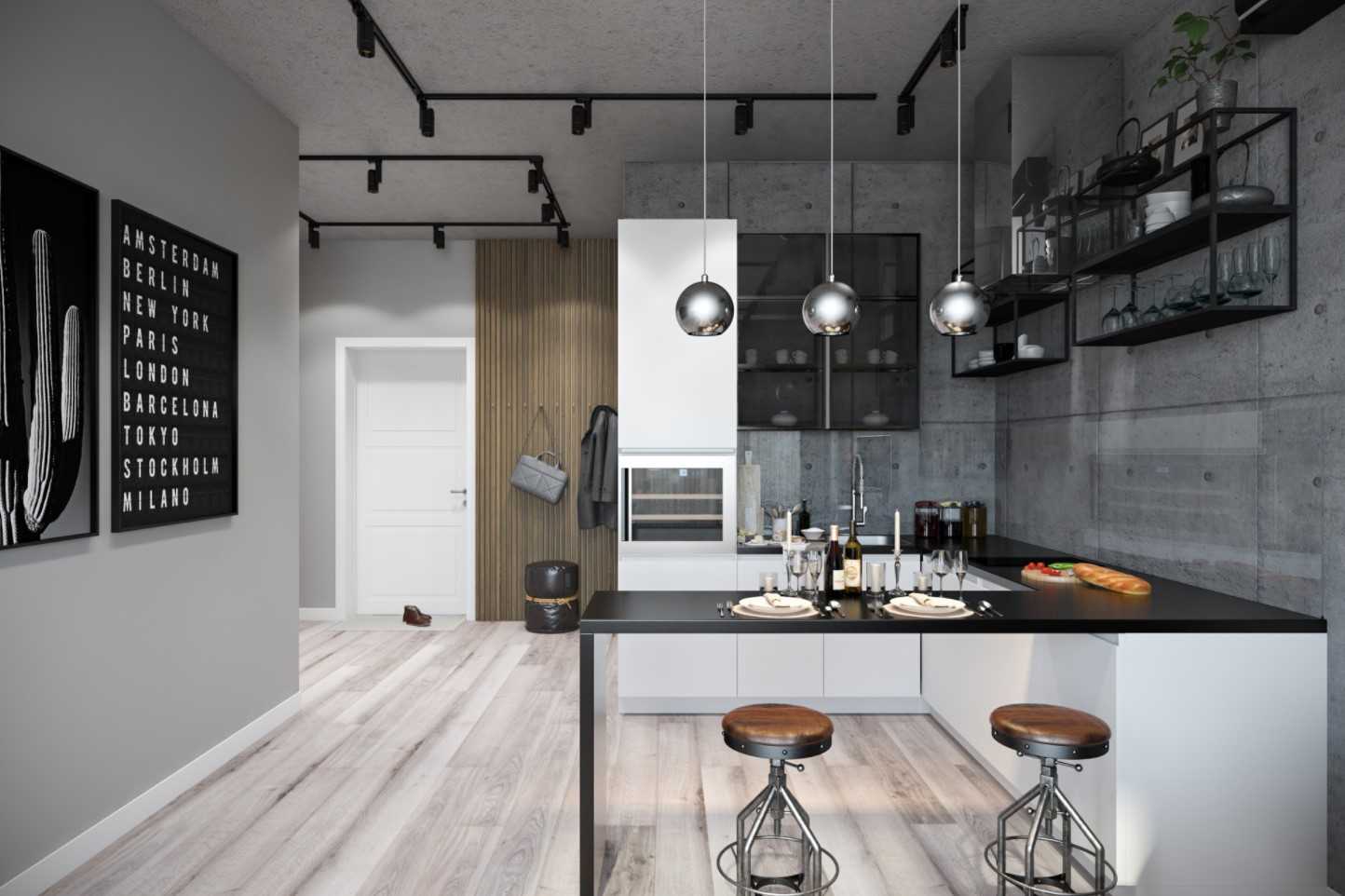 Кухня в стиле лофт – в данном случае можно не ограничивать полет фантазии и выбирать светильники самых смелых современных конструкций из натуральных или синтетических материалов. Для просторного помещения с высоким потолком рекомендуется подобрать большой подвесной светильник, который крепится к потолку специальными цепями или струнами.