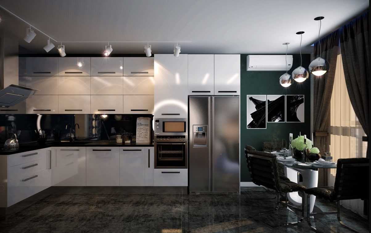 Такая конструкция создаст драматический эффект и станет необычной деталью интерьера, на которую сложно будет не обратить внимание. Кроме того, с помощью люстры черного цвета можно подчеркнуть белоснежный потолок и удачно оттенить все присутствующие на кухне белые поверхности