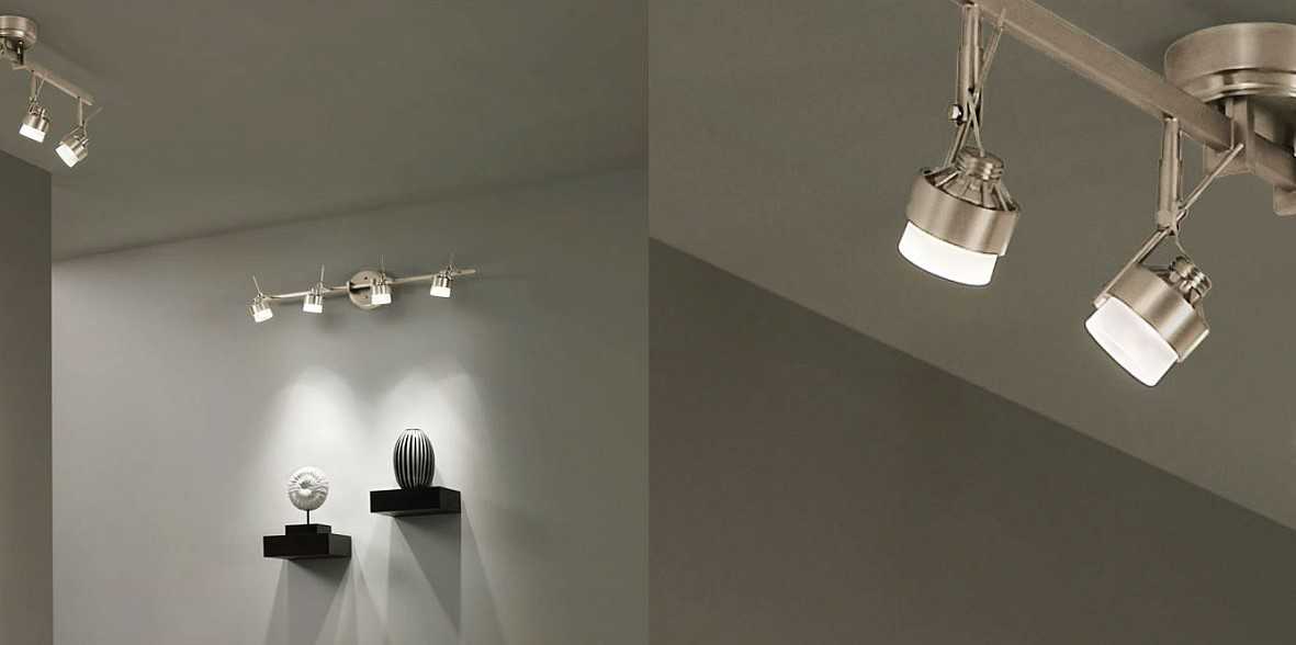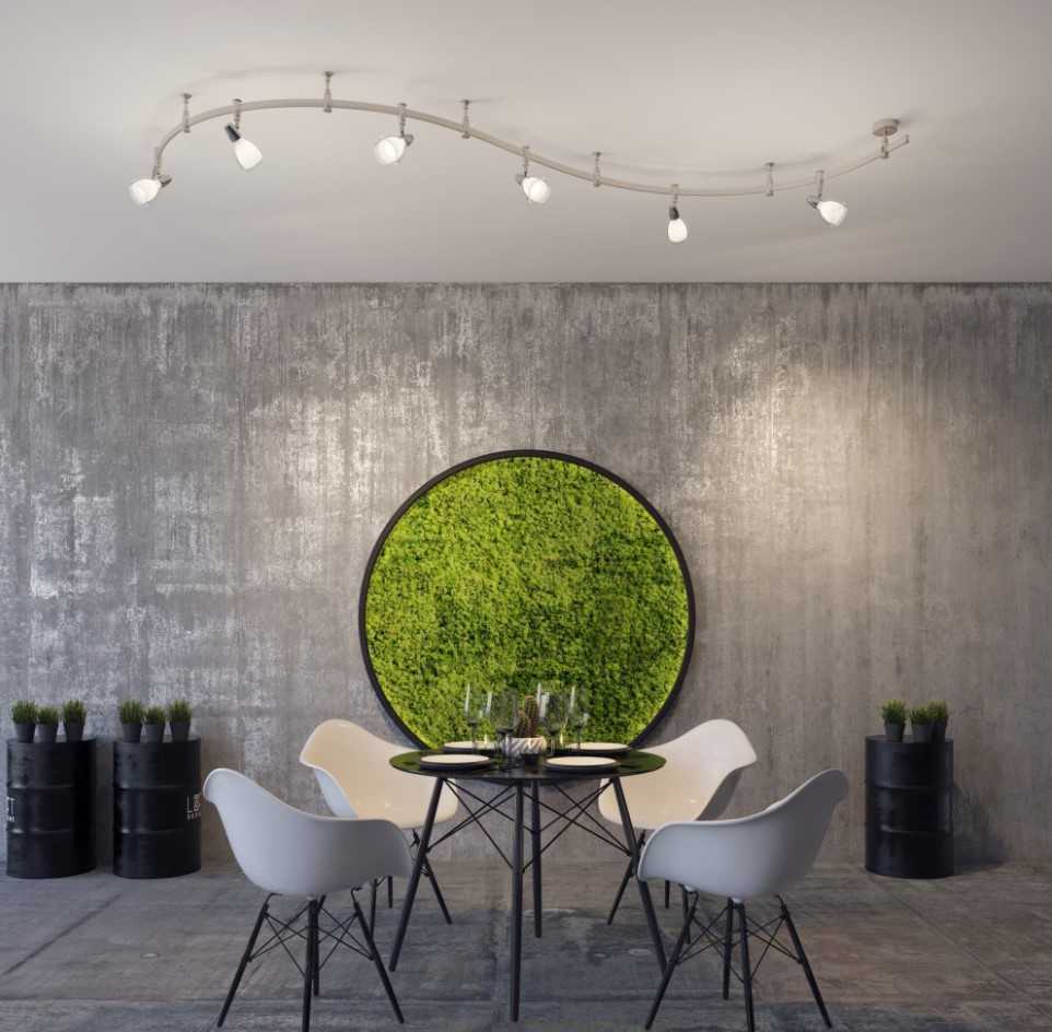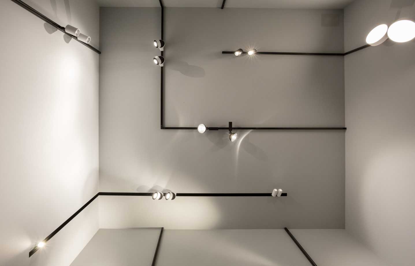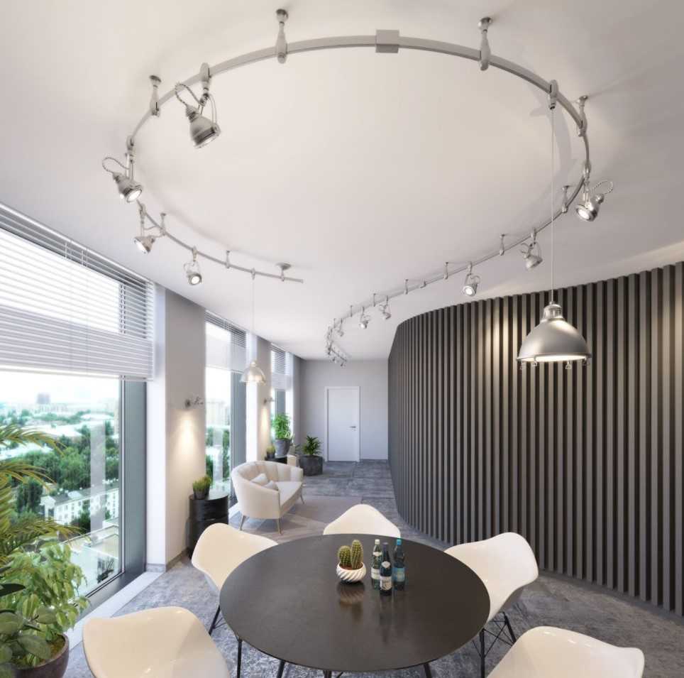 Прямой угол также соблюдается в квадратных и прямоугольных конструкциях. При этом никто не запрещает вам заходить на стену и размещать трек-систему там. Выгода от такого шага очевидна: можно усилить акцент в нужной зоне и добиться более выраженного освещения без усиления яркости лампы.