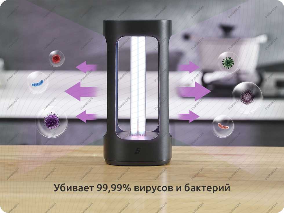 Испускаемый свет действует как дезинфектор и полностью уничтожает микроорганизмы в воздухе и на поверхностях. При этом короткий диапазон излучения совершенно безопасен для людей и животных.