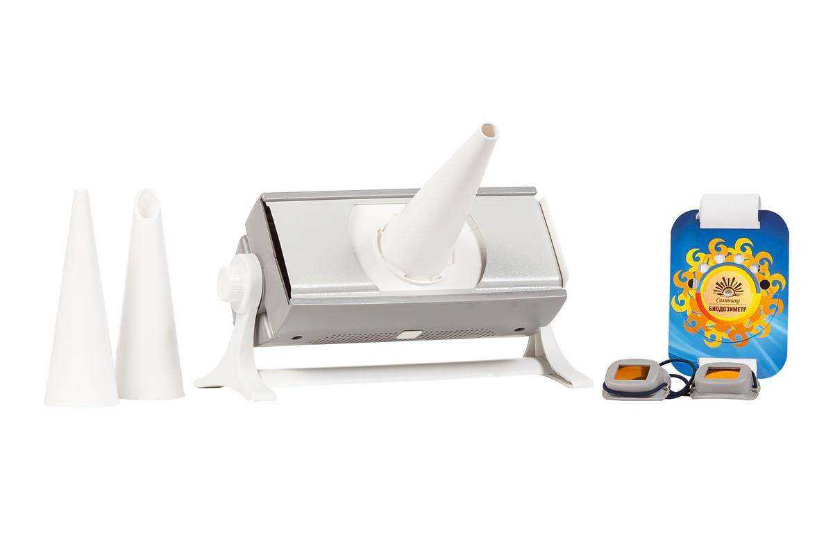 СОЛНЫШКО ОУФб-04 — это очень лёгкая, портативная, недорогая, но довольно мощная ультрафиолетовая лампа 2021 года. В комплекте идет простая инструкция по применению. Имеет пластмассовый корпус, комплектуется биодозиметром Горбачева для определения индивидуальной биодозы с учетом физиологических особенностей пациента. Может быть использован для обеззараживания небольших объемов воздуха до 30 м3 и поверхностей. Потребляемая от сети питания мощность не более 30 Вт. Изделие обеспечивает работу в течение 8 часов в сутки в циклическом режиме — 30 минут работа — 15 минут перерыв.