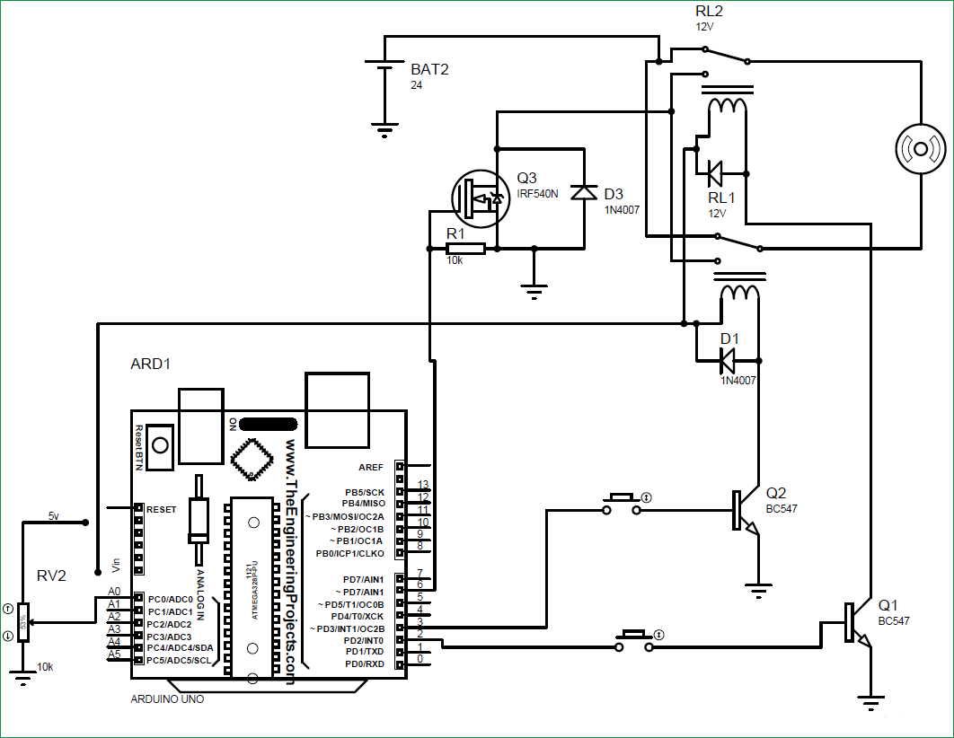 - подсоединить резистор 10 кОм между затвором и истоком MOSFET транзистора, а также подсоединить диод 1N4007 между истоком и стоком MOSFET транзистора;
