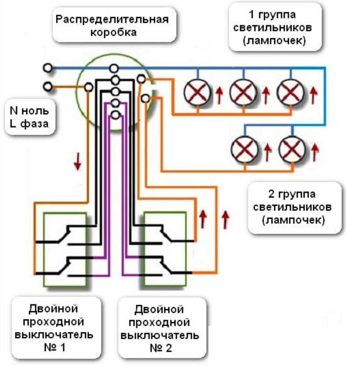 Схема подключения проходного выключателя 🔌 своими руками с 2-х и 3-х мест на две лампы