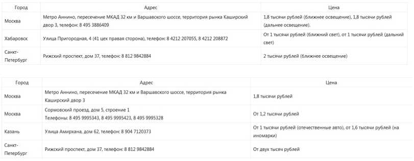 Ориентировочная стоимость работы по установке ксенона в головном освещении и противотуманных фарах в некоторых городах показана в таблицах: