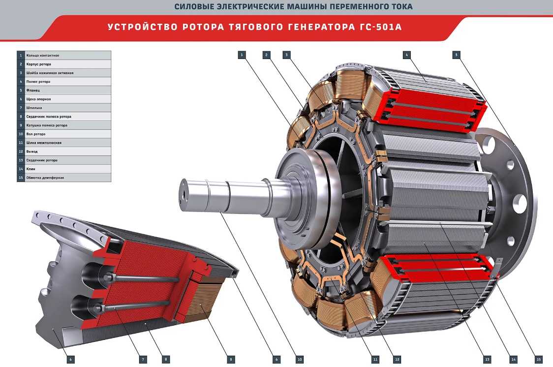 Его вращение осуществляется с помощью двигателя, мощность которого передается через обычный вал и некоторые опорные элементы. На валу также имеется возбудитель с постоянным значением электротока, питающий им обмотки катушки. Также среди компонентов имеется аккумуляторная батарея, которая инициализирует запуск стартера и может подавать электричество, если его не хватает для запуска двигателя, его работы