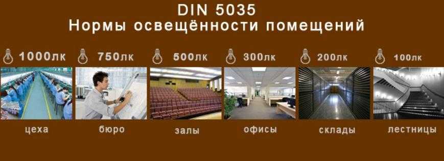 В расчет принимается естественное освещение, но основное внимание уделяется искусственному свету, так как с его помощью можно создать оптимальные условия вне зависимости от погоды на улице. Ниже приведены основные значения для разных помещений: