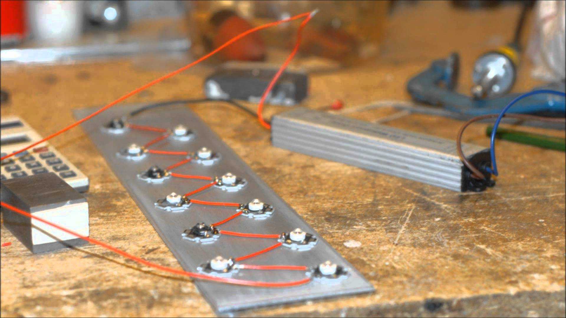 Светодиоды монтируют, наклеивая термопастой на алюминиевую радиаторную пластину. После установки их с помощью пайки последовательно соединяют проводами и подключают к пускорегулирующему устройству (драйверу) подходящему по силе тока.