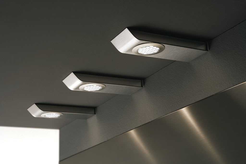 На кухне в центре внимания оказывается рабочая поверхность. Для ее освещения светодиоды или точечные светильники встраивают в нижнюю часть подвесных шкафов. Для удобства приготовления пищи каждый мебельный встраиваемый светильник необходимо правильно разместить. Источник света должен быть направлен вниз, чтобы не ослеплять повара во время приготовления блюда;