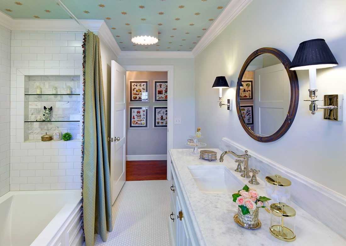 Освещение традиционной люстрой тоже актуально. Используются как потолочные светильники, так и подвесные модели. Но второй тип довольно громоздкий, люстру на подвесе рекомендуется размещать только в просторных комнатах площадью от 10 м² и больше. Поэтому в хрущевку с её крошечными габаритами втиснуть такой аксессуар не получится. Потолочные модели с плоскими плафонами, рассеивающими свет, уместны в средней по площади ванной от 6 м² и более.