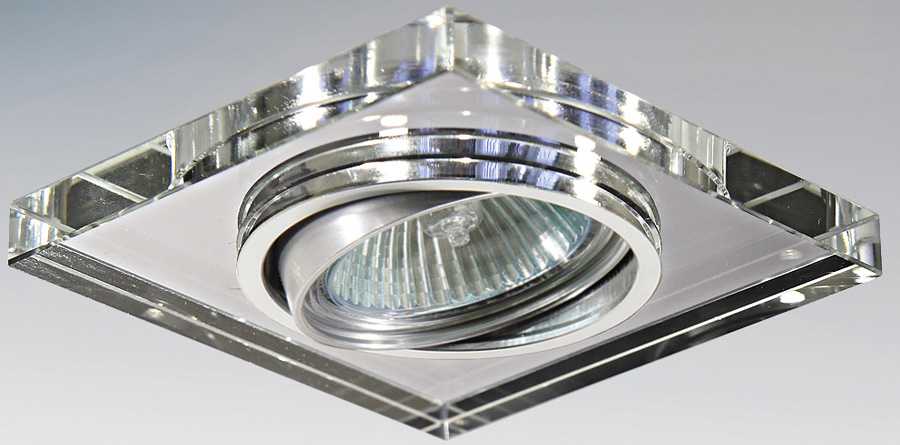 Поворотный встраиваемый светоприбор произведен по форме квадрата, который состоит из стекла. Внутри него располагается круг, в нем имеется плафон с лампочкой. Основа конструкции состоит из хромированного металла. Плафон в данном случае прозрачный, шириной 90 см, 10 мм высотой и диаметром врезного отверстия 65 мм.