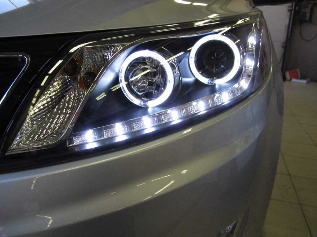 Светодиодные. На автомобилях такие приборы освещения используются пока не очень часто, однако специалисты уверены, что эти модели скоро заменят все остальные. Сегодня светодиодные приборы являются относительно дорогими, а их использование часто сводится к помещению в дневные ходовые огни или сигнальные лампочки. По сравнению с ксеноновыми и галогенными приборами, эти обладают небольшим спектром излучения при отсутствии ультрафиолетовых лучей, широким ассортиментом температуры света, большей яркостью и сроком эксплуатации. Стоит также отметить невосприимчивость моделей к вибрациям. Это стало причиной замены ими головной оптики на «Киа» и других авто. Как правило, эти приборы освещения используются в виде линейки светодиодов под противотуманными фарами или в радиаторной решетке.