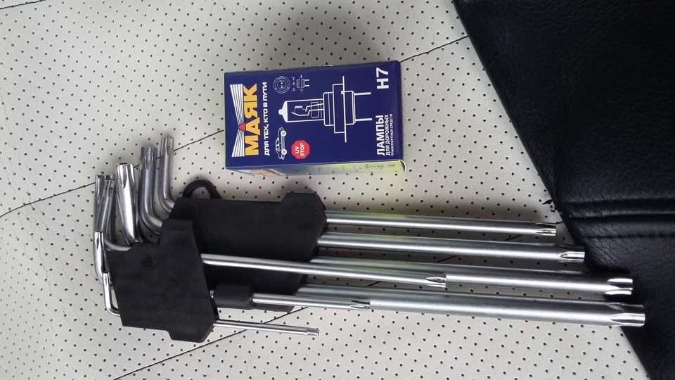 Вот и первый расходный материал с момента покупки авто. Перегорела лампочка ближнего света, со стороны пассажира. Открыл капот, посмотрел возможно ли достать лампочку из фары без каких-либо лишних манипуляций, но оказалось крайне неудобно. Потом всё-таки решил почитать умные книжки, полистать страницы в DRIVE2, чтобы не сломать ничего. После этого сразу стало ясно, чтоб поменять лампы необходимо всего лишь окрутить 3 винта вынуть фару и дальше менять лампочку. Но винты то необычные, а TORX. И причем два винта T30 и один T20. Поэтому решил купить себе набор ключей TORX, чтобы каждый раз не ходить попрошайничать. Но оказалось, что эти ключи, почему то, не во всех магазинах автозапчастей имеется. Но слава богу все нашел, все купил. Были куплены лампы Narva H7 (по 200 рублей)