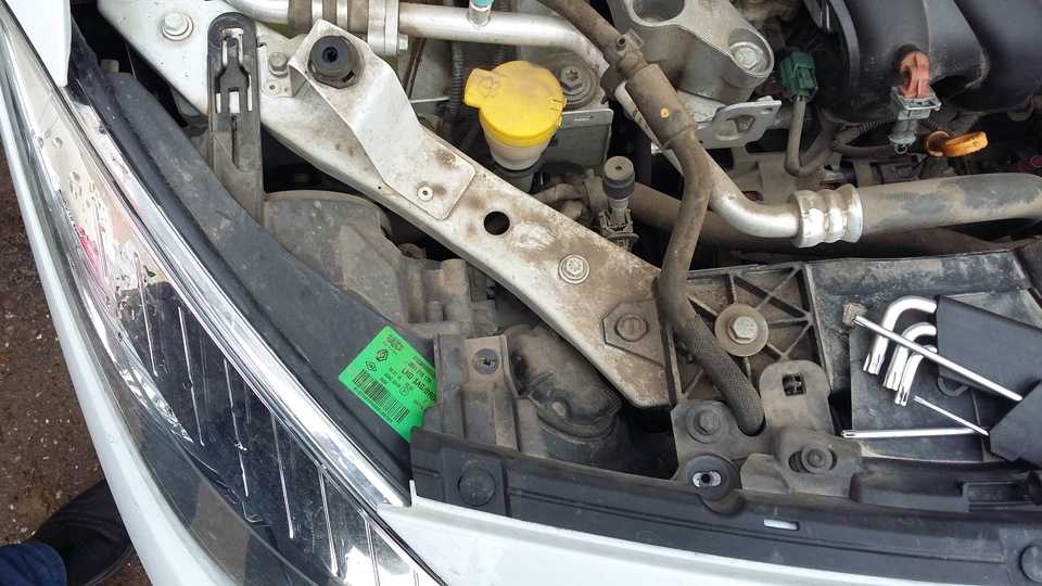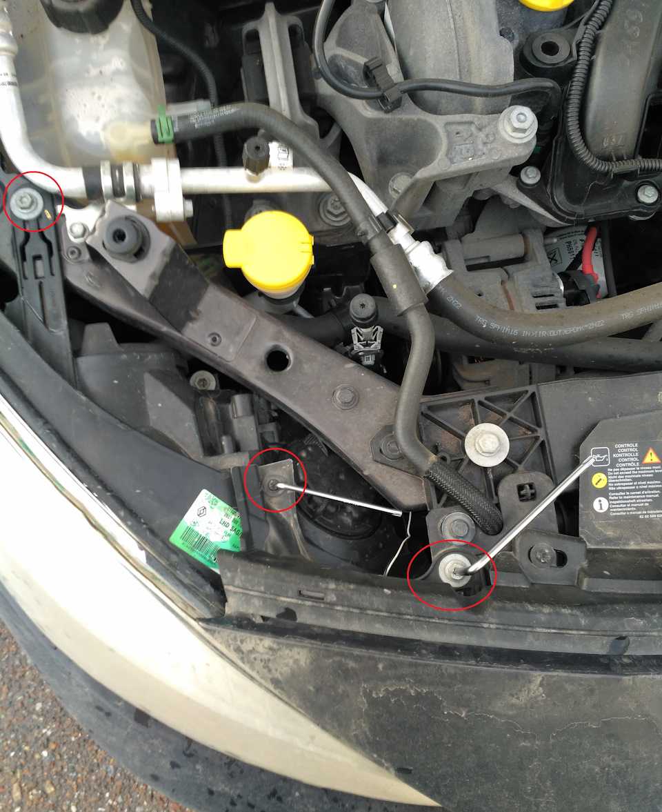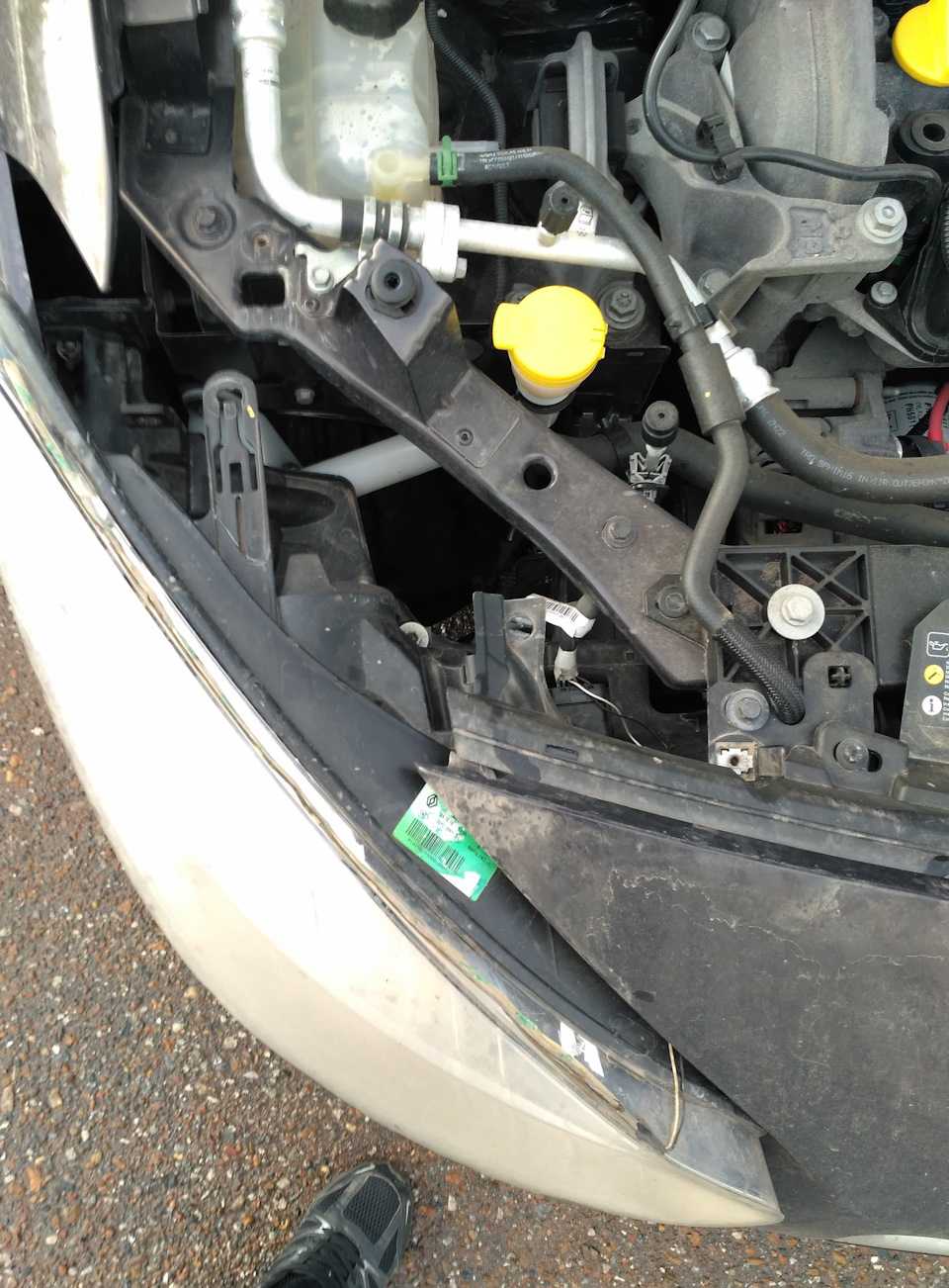 - Перед непосредственным извлечением фары, первоочередное, что нужно сделать – это провести демонтаж с автомобиля. Открываем капот и, используя плоскую отвертку, аккуратно поддеваем крепления, с помощью которых бампер присоединен к кузову Рено, и извлекаем их.